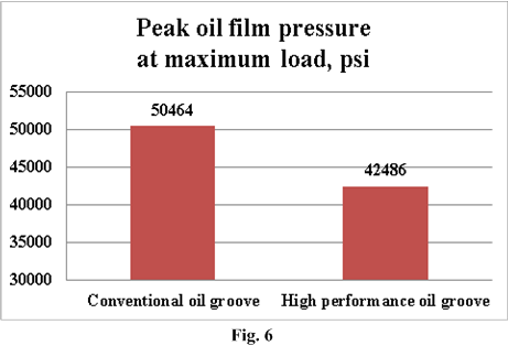 The greater effective area of the modified (high performance) bearing resulted in lower loads as compared to the bearing with the conventional groove design. The values of the maximum loads are shown in Fig.4.